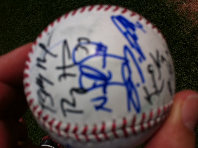 It was Family Fun Day. That meant you could go on the field and play catch or get autographs before the game. My daughter is well informed so once we got on the field she went right to Castellanos, the third baseman of the future. This turned out to be a good strategy because this took her to the far end of the player line and she had half the team before she really had to start waiting in line. She ended up with over 20 signatures.