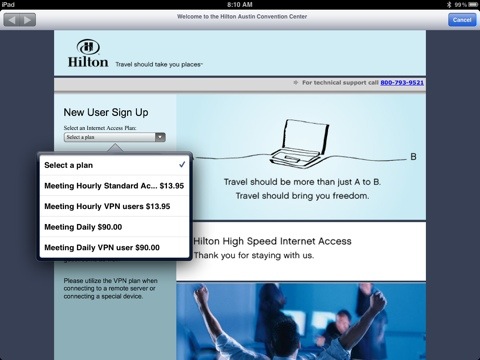 The iPad experiment is a failure. It is Hilton’s fault. After charging $169 per night for a room they want more for wireless. This is while I will not use Hilton Hotels on non-business travel. This is not customer friendly. I will upload all of these at the end. (EDIT: The lobby coffee shop has free internet).