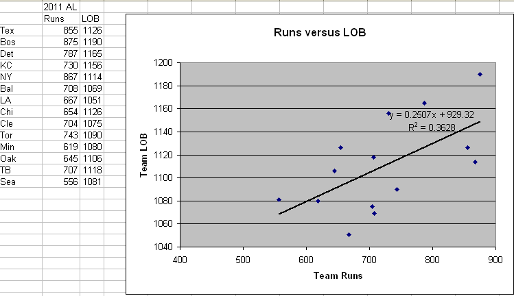 Just a quick report. Someone asked whether runs correlated well with LOB. I could see it going either way. It could be that more runners leads to more LOB and more runs both. Or, maybe worse teams strand a lot of their baserunners because no one hits them in. It turns out in 2011 in the AL runs only explained 36% of LOB.