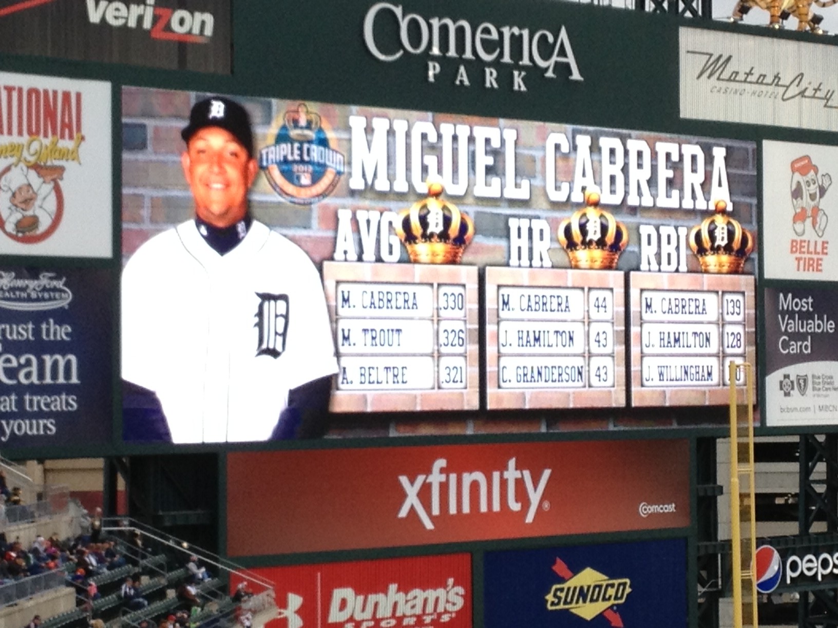 Our neighbors understood baseball and were very excited about the Tigers being in the playoffs so it was a pleasant evening. Every Cabrera at bat brought out MVP chants. I caught this screen capture of a scoreboard image before the game.